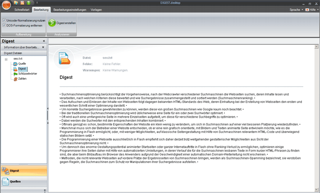 Die Software DIGEST bildet das menschliche Querlesen nach. Allerdings liegt die Geschwindigkeit des Programms in ganz anderen Dimensionen. Auf Knopfdruck werden in Sekundenschnelle in digitaler Form vorliegende Texte erfasst und analysiert. Egal, ob Dokument, Mail, Attachment oder Webseite – DIGEST filtert die wichtigsten Informationen aus Texten und fasst Sie dem Sinn entsprechend zusammen. Dabei wird DIGEST ohne weiteres auch mit fremdsprachigen Texten fertig. So erhält der Nutzer im Handumdrehen einen Überblick über die Inhalte und kann zielsicher entscheiden, welcher Text es Wert ist, vollständig gelesen zu werden. Uninteressantes kann von vornherein ausgeschlossen werden.
